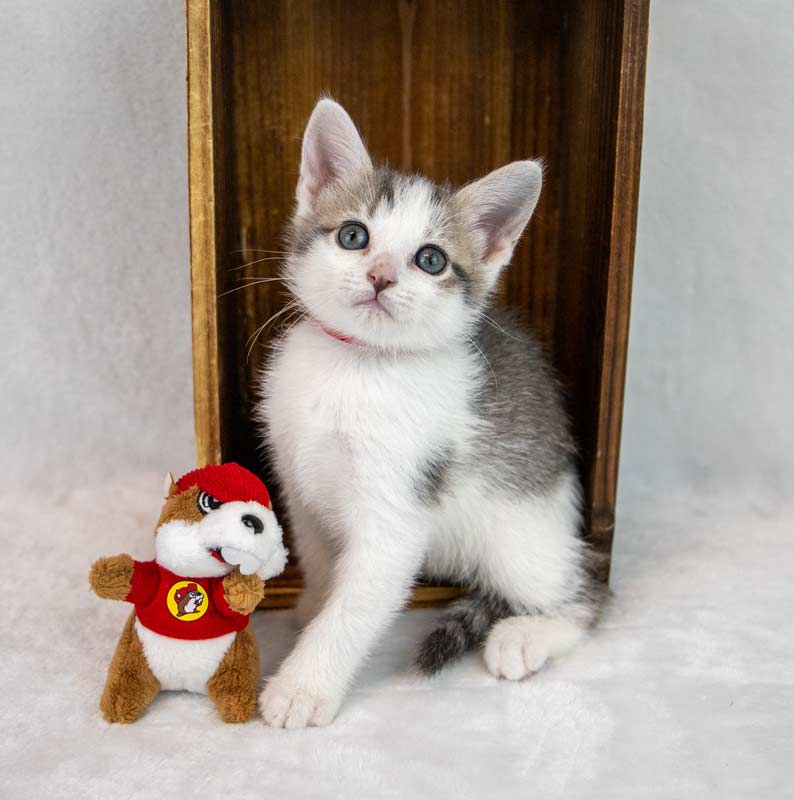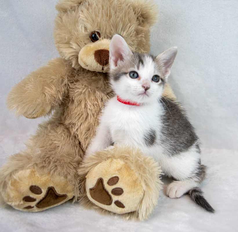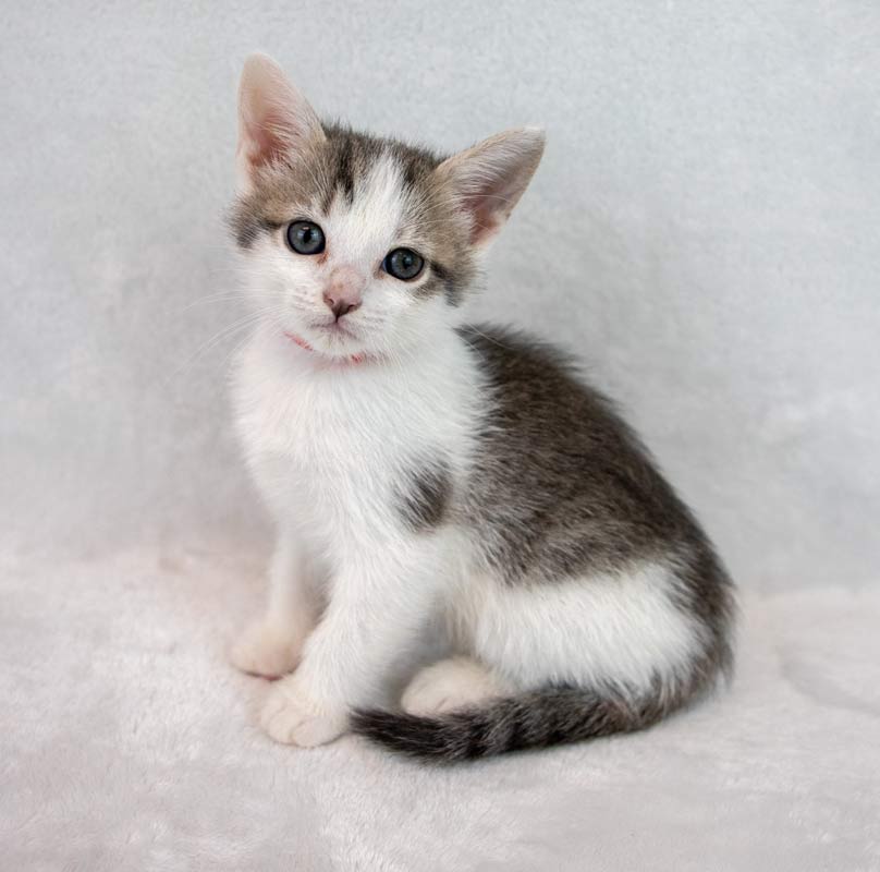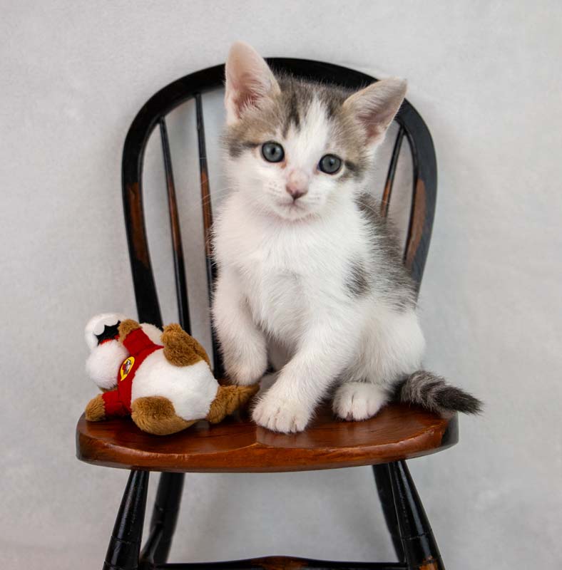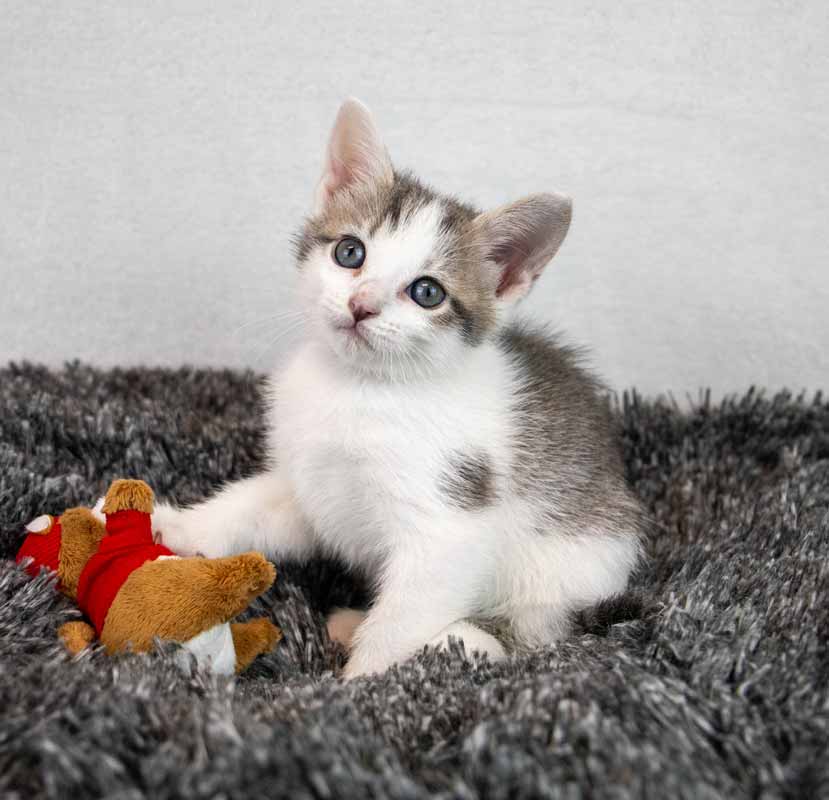 • LIKES/DISLIKES: I’m all about fun and snuggles — especially both at once. I love curling up with my siblings on your lap for cozy cat naps (that’s the best kind of nap, if you ask me). But when I’m not snoozing, I’m on the move! I love chasing toys across the floor and leaping high to catch dangly things — fish, mice, fuzzy balls, ribbons — you name it, I’ll jump for it! The cat tree is my playground and my favorite nap spot. I climb, play, hide, and then flop down for a good sleep right on the top perch. / I’m a young kitten, so sudden noises (like the icemaker) startle me initially, but I get used to unfamiliar noises pretty quickly. Otherwise, I can’t think of any dislikes since I am a kitten, but I would not be happy if I did not get the love and attention all kitties deserve!
